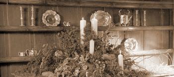 Украсить надо и стол непременно. Во-первых, скатертью. Во-вторых, новогодним сервизом, который, по мнению некоторых знатоков, должен обязательно состоять из белого фарфора и серебра. В третьих, маленькими букетами из цветов и еловых веточек и свечами в композиции с дарами леса в виде шишек, желудей, мха. Чтобы подчеркнуть торжественность момента, можно организовать освещение так, чтобы ярко выделялся стол, а пространство вокруг оставалось чуть затемненным.