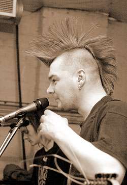 Однако уже на входе я увидел человека с большим красно-малиновым ирокезом под цвет клетчатой юбочки, как у шотландцев, одетой поверх таких же ярких штанов. Как выяснилось, это был вокалист «G.X.F.» Гари, в лице которого самые внимательные могли распознать контрабасиста группы, приезжавшей пару раз во Псков, «Rattlesnakes».