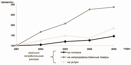 Реальные потребительские расходы сельского населения на покупку продуктов питания в 2005 году возросли по сравнению с 2001 годом на 45,7 процента, непродовольственных товаров – в 2,9 раза, алкогольных напитков – на 54,7, на оплату услуг – на 85,6 процента.