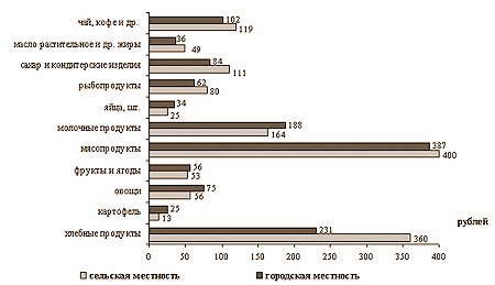 В 2005 году сельское население покупало масло животное, масло растительное, сосиски, сардельки, сахар по ценам выше, чем городское население на 5-6 процентов, морепродукты соленые, сушеные, копченые – на 9 процентов, мясные и мясорастительные консервы – на 21, рыбные полуфабрикаты и готовые изделия – на 24 процента. Средние цены на колбасу, хлеб ржаной, пшеничный, мясо птицы в сельской местности были ниже, чем в городской местности соответственно на 2, 6, 9, 13 процентов.