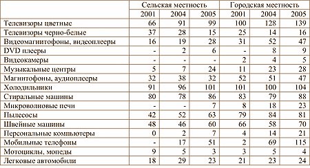 Расходы на приобретение одежды, обуви, тканей группы населения с наибольшими располагаемыми ресурсами превышали расходы населения с наименьшими располагаемыми ресурсами в 6,7 раза, телерадиоаппаратуры, предметов для отдыха, увлечений – в 15,3 раза, а по такой группе товаров, как мебель, домашнее оборудование, предметы ухода за домом, дифференциация составляла 22,9 раза. Различия в обеспеченности домохозяйств с различным уровнем располагаемых ресурсов предметами длительного пользования на конец 2005 года в наибольшей степени наблюдались по таким предметам длительного пользования, как видеомагнитофоны (в 5,2 раза), персональные компьютеры, DVD-плееры (в 2,5 раза), пылесосы, легковые автомобили (в 2,3 раза), музыкальные центры (в 1,8 раза). В тоже время по количеству имеющихся холодильников и магнитофонов значительных различий не наблюдалось. На конец 2005 года в среднем на 100 домохозяйств с наименьшими располагаемыми ресурсами, проживающих в сельской местности, приходилось 104 холодильника, 52 магнитофона, в домохозяйствах с наибольшими располагаемыми ресурсами – соответственно 100 холодильников и 51 магнитофон.