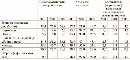 Изменения, связанные с развитием рыночных форм хозяйствования, трансформацией собственности привели к сокращению числа крупных и средних сельскохозяйственных организаций в 2005 году по сравнению с 2001 годом почти в 3 раза, крестьянских (фермерских) хозяйств – на 14 процентов, хозяйств населения, занимающихся сельскохозяйственной деятельностью – на 4 процента.