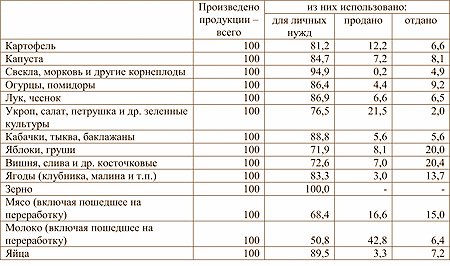 Основная часть продукции растениеводства (72%-100%) и продукции животноводства (51%-90%), полученной из личного подсобного хозяйства в 2005 году, использовалась домашними хозяйствами для личных нужд (на питание, на корм скоту, на семена). Продавалась незначительная часть полученной в личном подсобном хозяйстве продукции растениеводства, за исключением укропа, салата, петрушки и других зеленных культур (21,5% от общего производства), картофеля (12,2%). Доля проданной продукции животноводства составляла: говядина, телятина - 42 процента от общего объема производства, свинина – 12,7, баранина, козлятина – 10,2, мясо птицы – 10,5, сало – 7,8, молоко и молочная продукция – 42,8, яйца – 3,3 процента. Наибольший удельный вес отданной домохозяйствами продукции занимали фрукты, ягоды, мясопродукты.