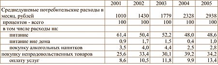 В 2005 году по сравнению с 2001 годом в структуре потребительских расходов сельского населения увеличилась доля расходов на непродовольственные товары на 8,6 процентного пункта и оплату услуг - на 4,8, уменьшилась - на питание на 12,8, на алкогольные напитки - на 0,7 процентного пункта.