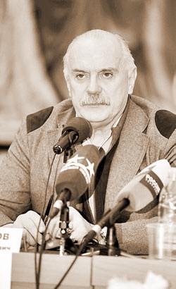 Высокие гости оглядели масленичный макет и журналистов, избавившихся наконец от необходимости вжимать голову в плечи. Никита Михалков оценил одну из выставленных здесь же картин Игоря Шаймарданова, пошептался о чем-то с коллегой по цеху Дмитрием Месхиевым, и пресс-конференция началась.