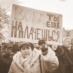 Однако несколько сатирических плакатов на Пушкинской площади все же было: «Шесть лет коту под хвост», «Вова, ты еще наплачешься», «Мой президент не пьет и не Путин», «Прощай, немытая 12 лет», «Умом – нет, задом – да» …Скандировали, в основном, привычное: «Россия без Путина!» и «Путин – вор!».